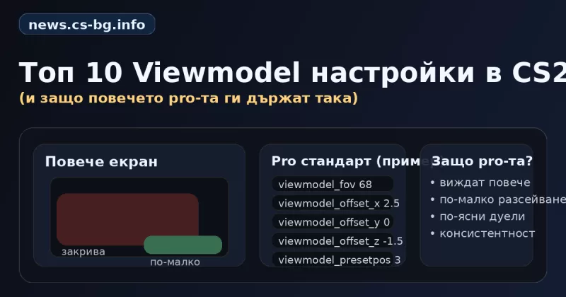 Viewmodel-ът в CS2 е като позицията на волана: не ти прави колата по-бърза, но ако ти е неудобно – ще караш по-зле и ще се чудиш “защо всички ме изпреварват”. Най-често причината pro-та да си държат оръжието “настрани и надолу” е проста: да не им закрива екрана и да им е всеки рунд еднакво, защото мозъкът обича консистентност, а не “днес ми е друго, ама утре ще свикна”.