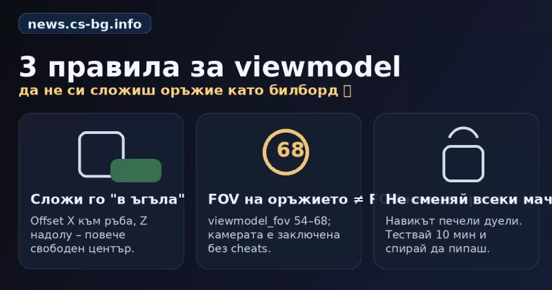 | 4 | AWP Clean | За AWP/Scout дуели – минимално пречене в ъглите | viewmodel_presetpos 3; viewmodel_fov 68; viewmodel_offset_x 2.3; viewmodel_offset_y -1; viewmodel_offset_z -2 |