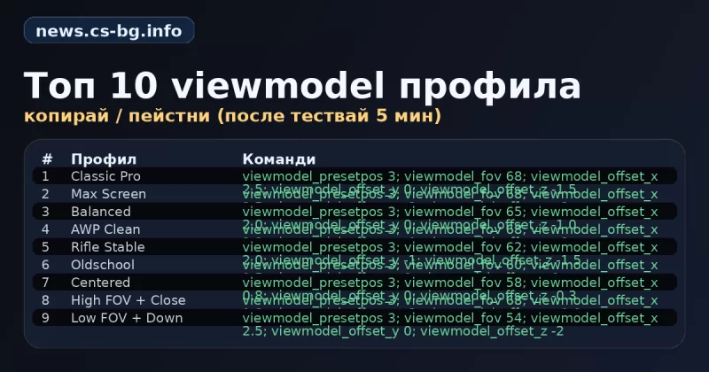 Тук идеята е да ти дам готови профили за копиране, които покриват различни вкусове: “максимално изнесено”, “баланс”, “oldschool”, “AWP clean” и т.н. Не се вкопчвай в точните числа като религия – гледай дали ти е удобно да виждаш и да стреляш спокойно, защото най-добрият viewmodel е този, който не ти прави мозъка на салата.